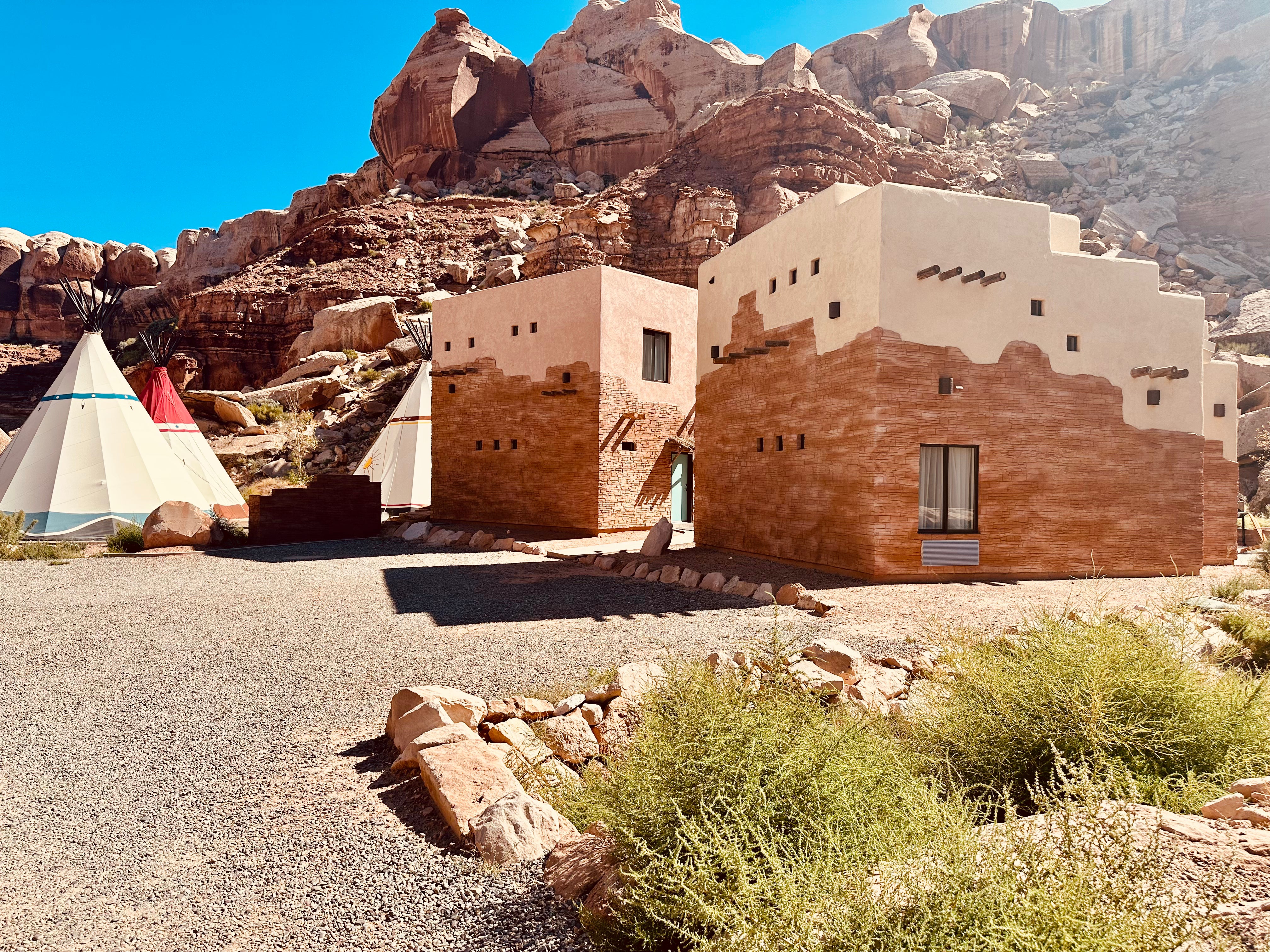 Drive to your next destination Bluff Dwellings Resort & Spa in Bluff, Utah where you'll spend some time relaxing and have a cultural experience sleeping overnight in a traditional 🏕️ Native American tipi.